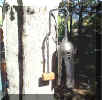 Overview: This piece is created mainly from a decommissioned SCUBA tank. It hangs from a forged leaf bracket along with the mallet (which is forged steel and locust wood). Aside from looking rather interesting, it is also a bell -- ergo the mallet.