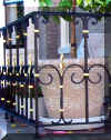 Chapel, PA Overview: Exterior railing forged to match existing early 1900s ironwork on home. Rivets, collaring and tenoning used in joinery. Reproducing spiral “flames” in center proved more challenging than we expected – but successful in the end.