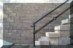 Date: April 2001 A challenging commission this, as the side retaining wall and the treads of the stairs were not matched. Posts were forged from heavy 1" square bar, and side rails were made from 1/4" x 11/2" bar. Rail was sandblasted, then primed and painted with Rustoleum Dampproof Primer© and Rustoleum Industrial Enamel©.